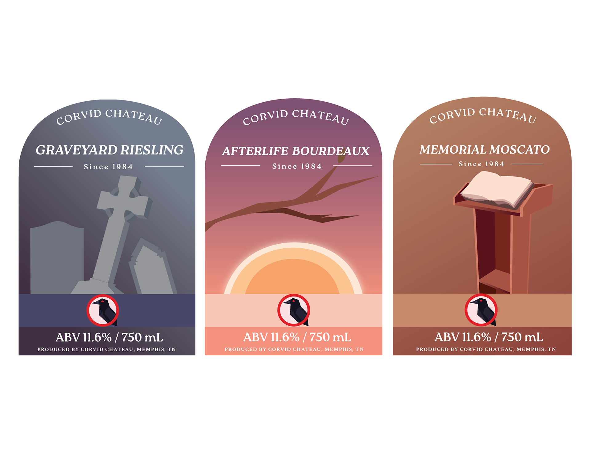 Corvid Chateau is a fictional winery that specializes in combining the morbid with the everyday. Their signature wines focus on the funeral procession and the process of grief.